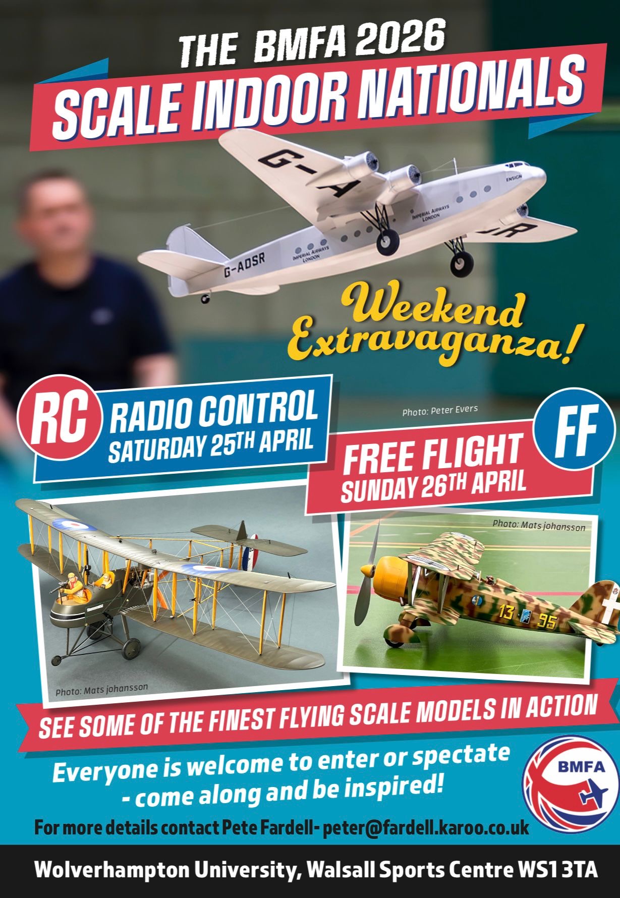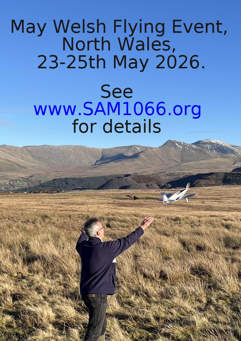 A free flight scale and fun fly meeting in North Wales 23-25th May 2026. Outdoor flying at a great site, also an indoor session. Some competitions. See details on link above.